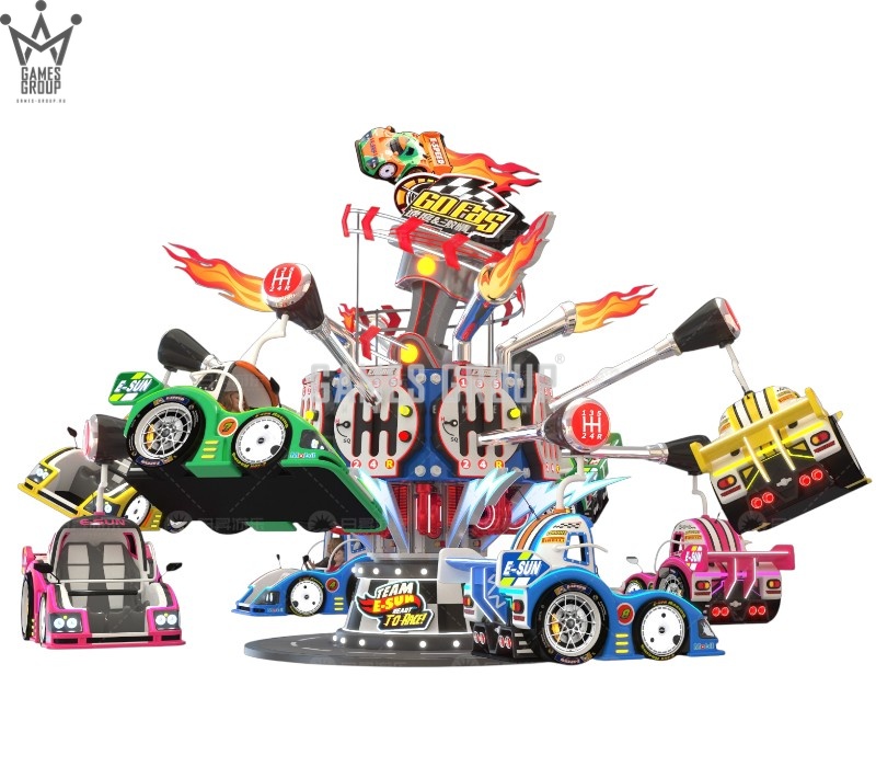 • Дизайн в стиле гоночных автомобилей. Каждый элемент аттракциона выполнен в ярких цветах и стилизован под спортивные машины, что создает атмосферу настоящего гоночного трека.
