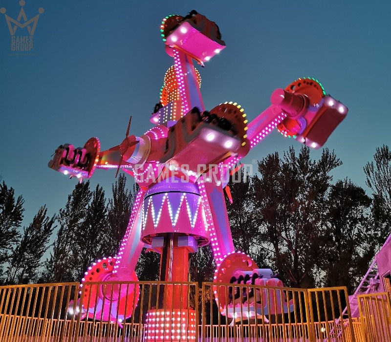 эффектный внешний вид — вращающиеся лопасти и динамическая подсветка делают аттракцион визуальным центром парка.