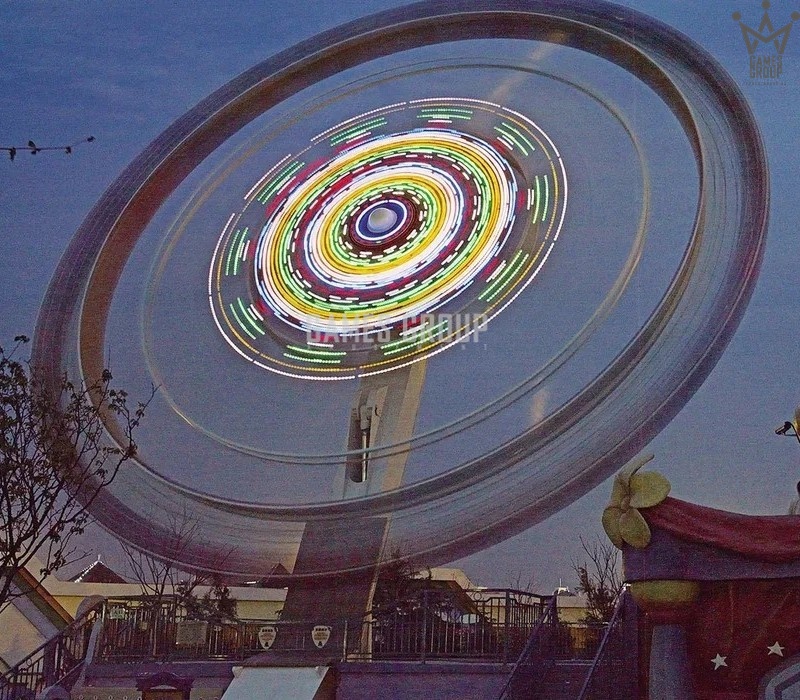 Пассажиры в гондоле постепенно поднимаются и опускаются на 360 градусов, одновременно с поворотом колеса.