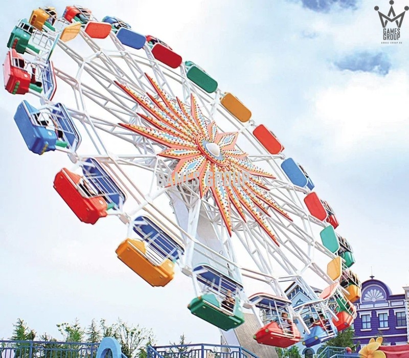 Конструкция состоит из вращающегося вертикального колеса с несколькими кабинами или гондолами, прикреплёнными к колёсному ободу.