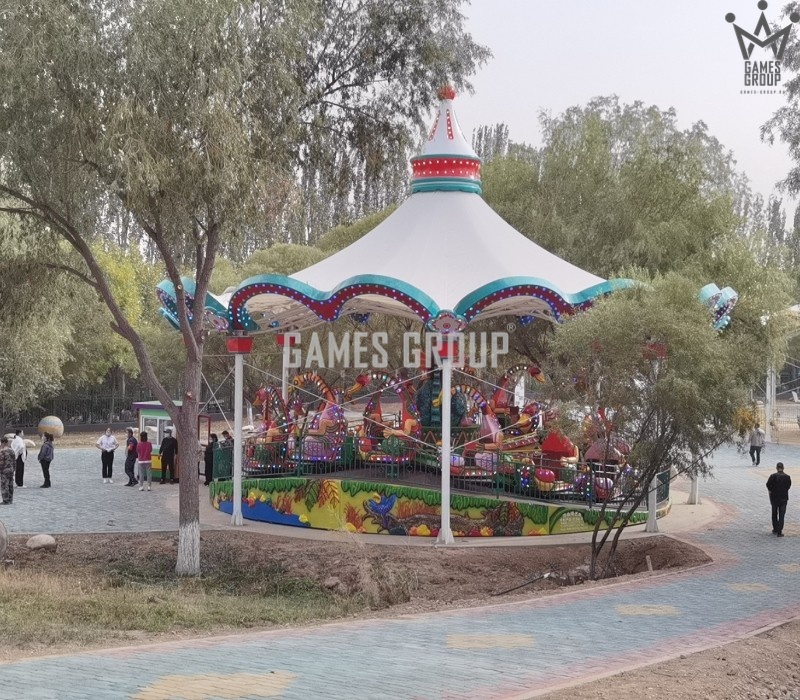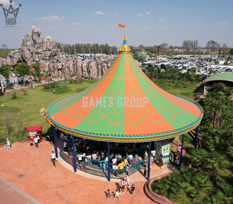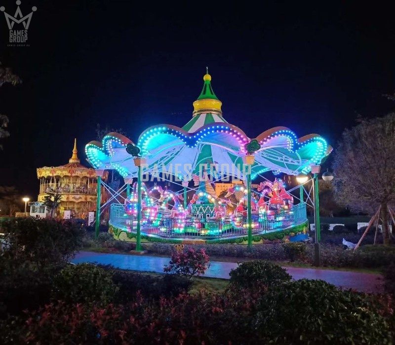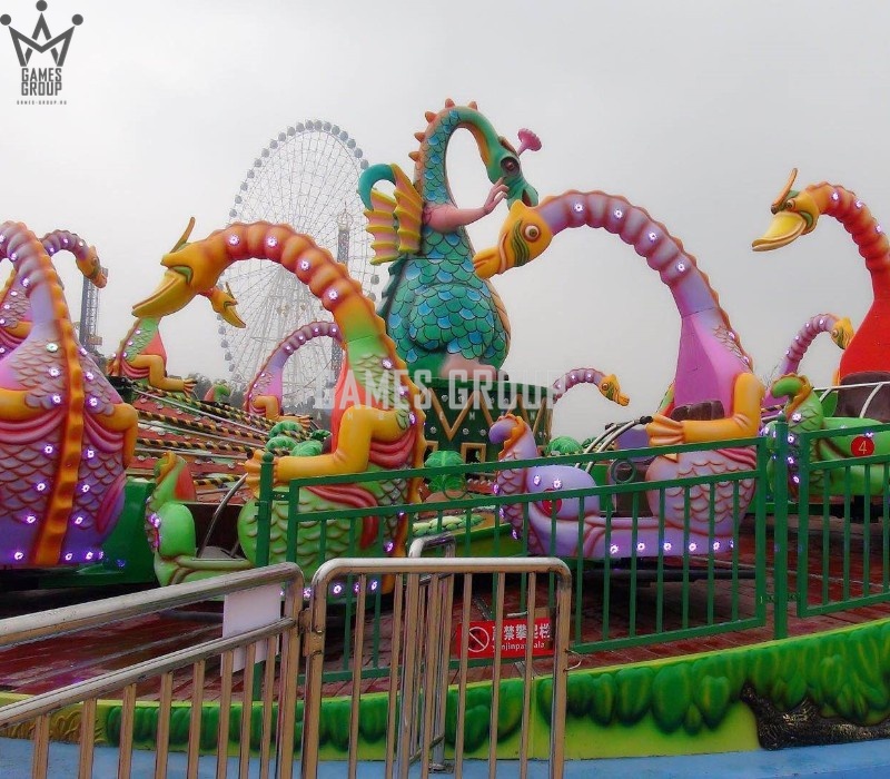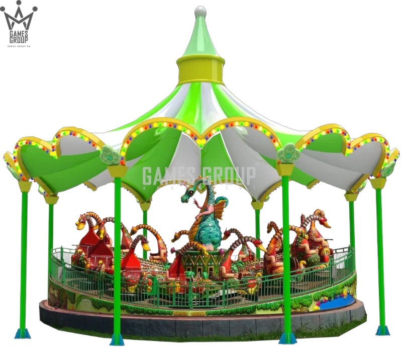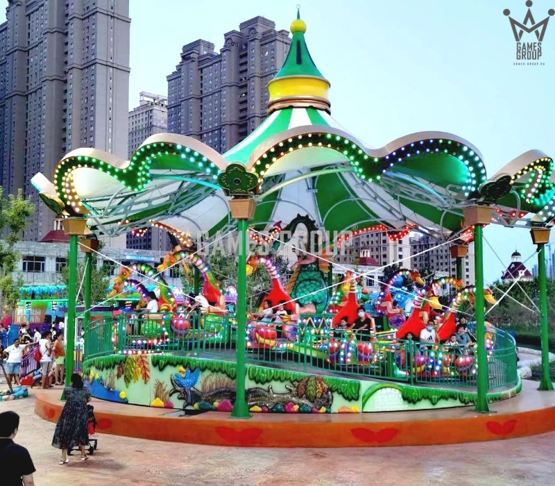 Уникальный дизайн. Карусель выполнена в виде платформы с динозаврами, которая постепенно ускоряется.