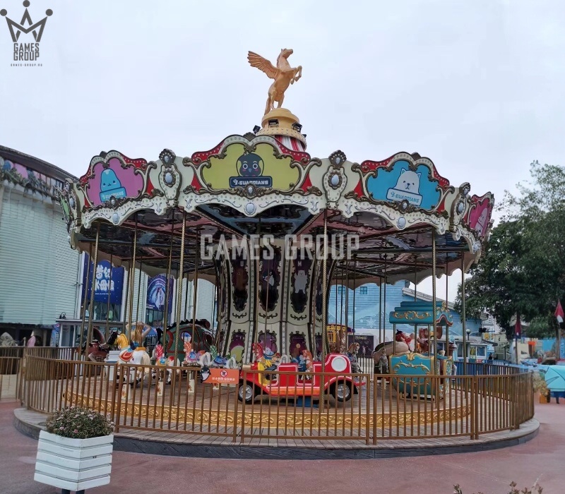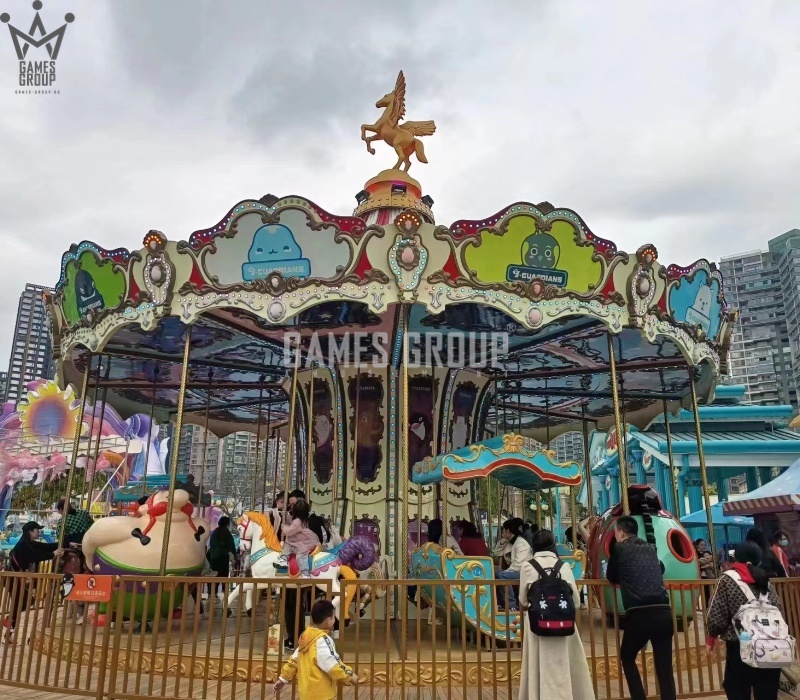 | Принцип работы | вращение по кругу, подъем и спуск сидений лошадок автоматически |